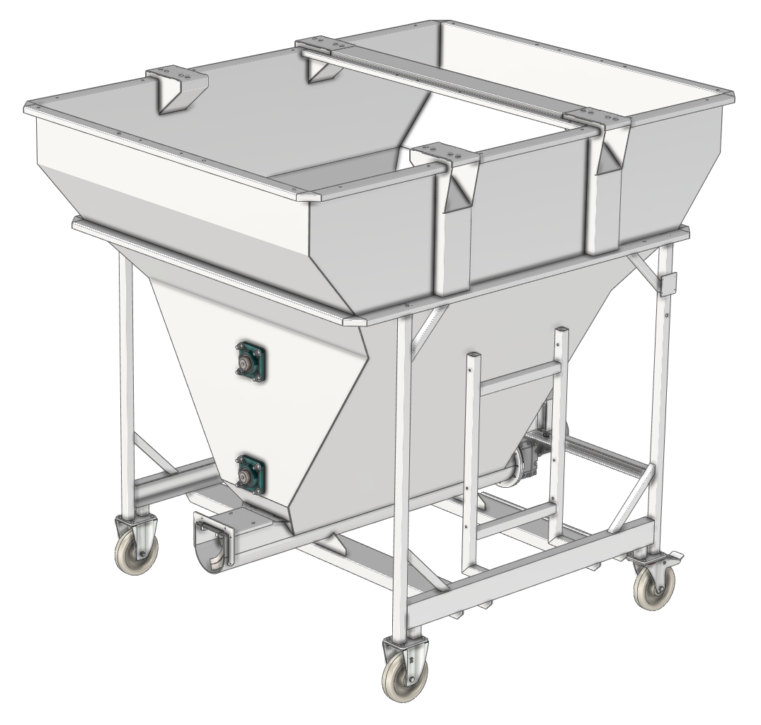 Násypka může být z horní strany částečně nebo zcela zakrytá. K dispozici je víko plné, částečně nebo zcela otevíratelné z vodovzdorné překližky nebo síťované. Usazení násypky může být na pojezdových kolech s vysokou nosností nebo na pevných podpěrách. Standardně vyráběné modely násypek jsou uvedeny v tabulce na zadní straně. Jsme schopni přizůsobit provedení zvláštním požadavkům nebo navrhnout a vyrobit i jiné provedení dle zadaných rozměrových specifikací. Pohony šneku a vnitřních aktuátorů zajišťují asynchronní třífázové motory s kvalitními bezúdržbovými převodovkami s čelním ozubením. Násypka může být dodána bez elektroinstalace nebo s kompletní instalací a rozvaděčem s frekvenčními měniči pro plynulé řízení dopravního výkonu i s připojeným dopravníkem. Integrace do výrobní linky může být modifikovaná dle požadavků